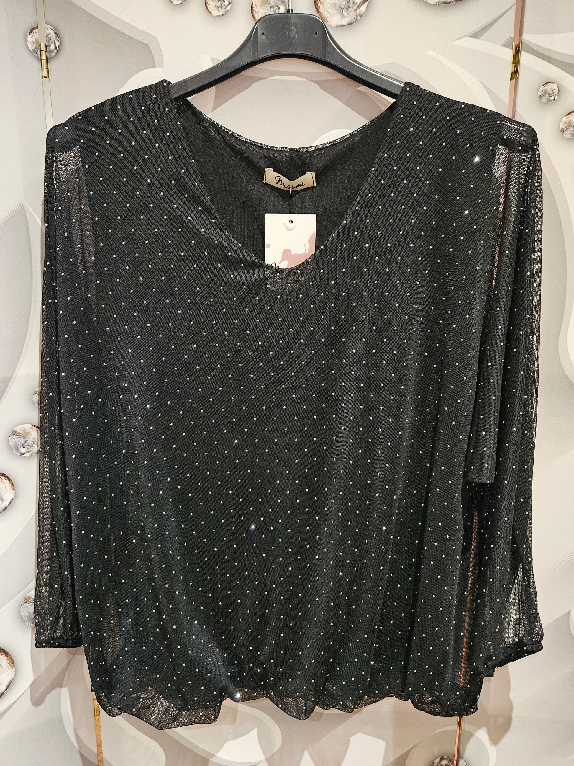 Long sleeve blouse with a low, rounded v-neckline. It has a sheer top layer with small studded sequins all-over. The long sleeves are sheer with the same sequin detail as the body. A slightly loose fit. Available in black. One size available.
