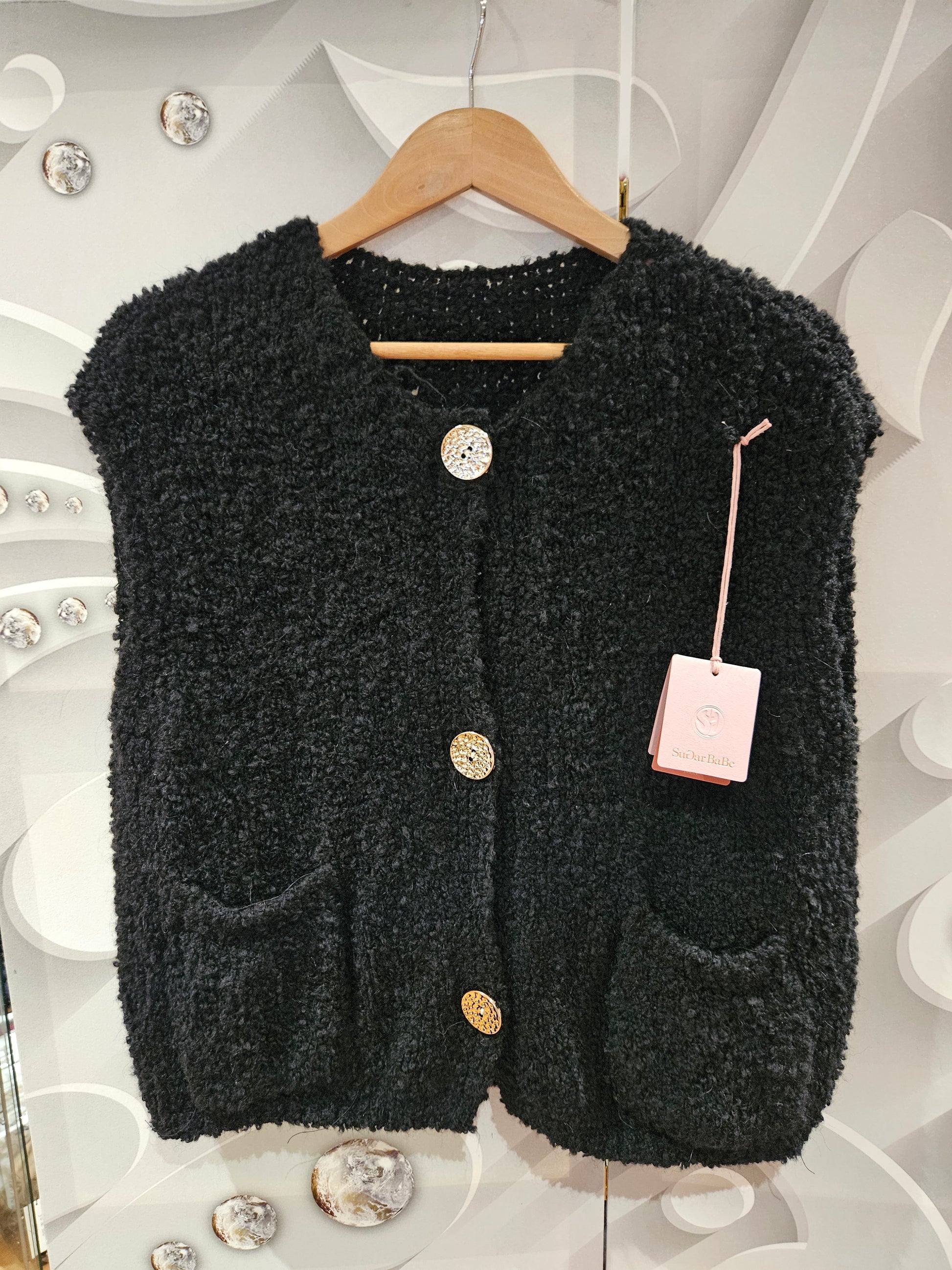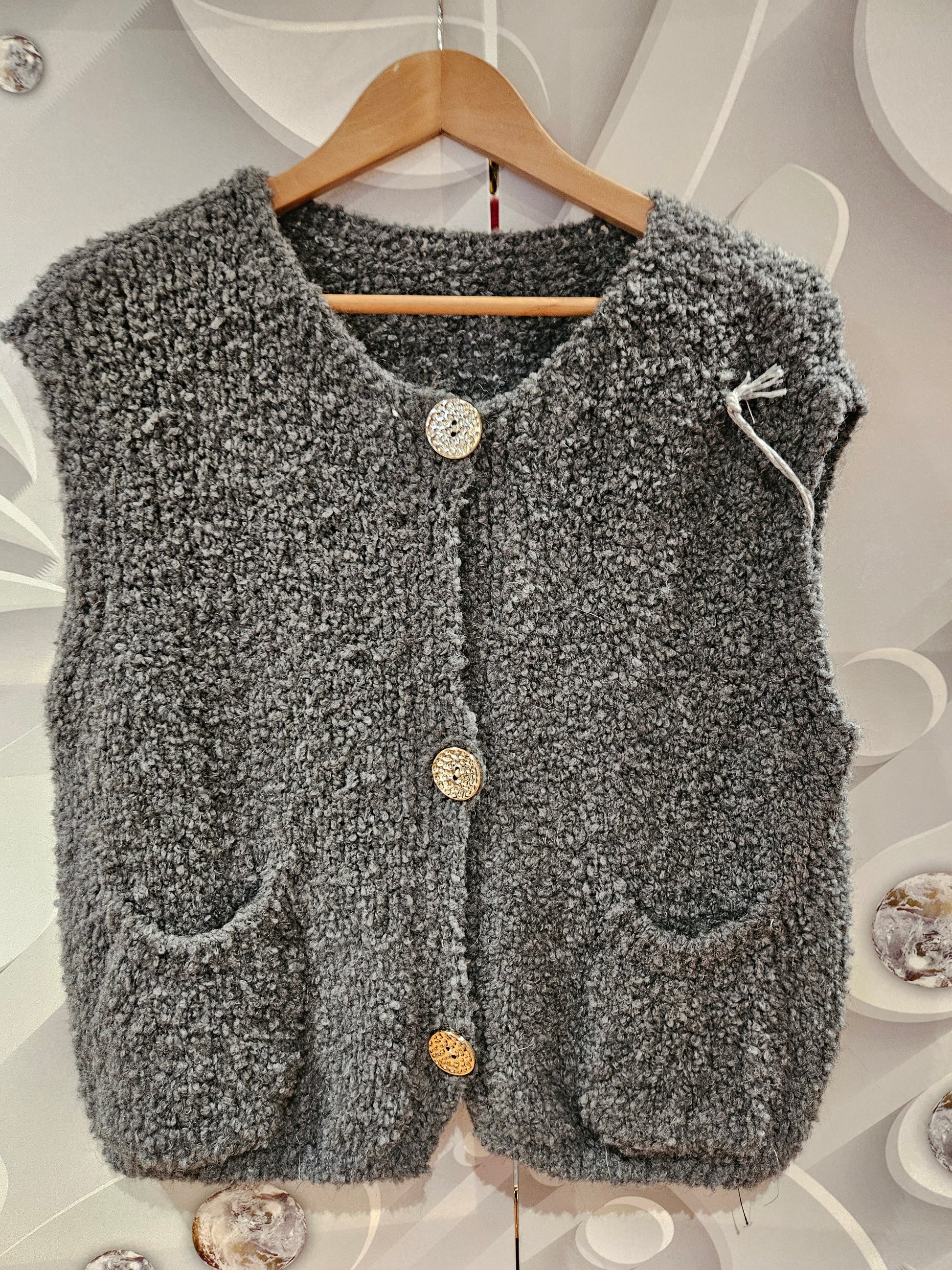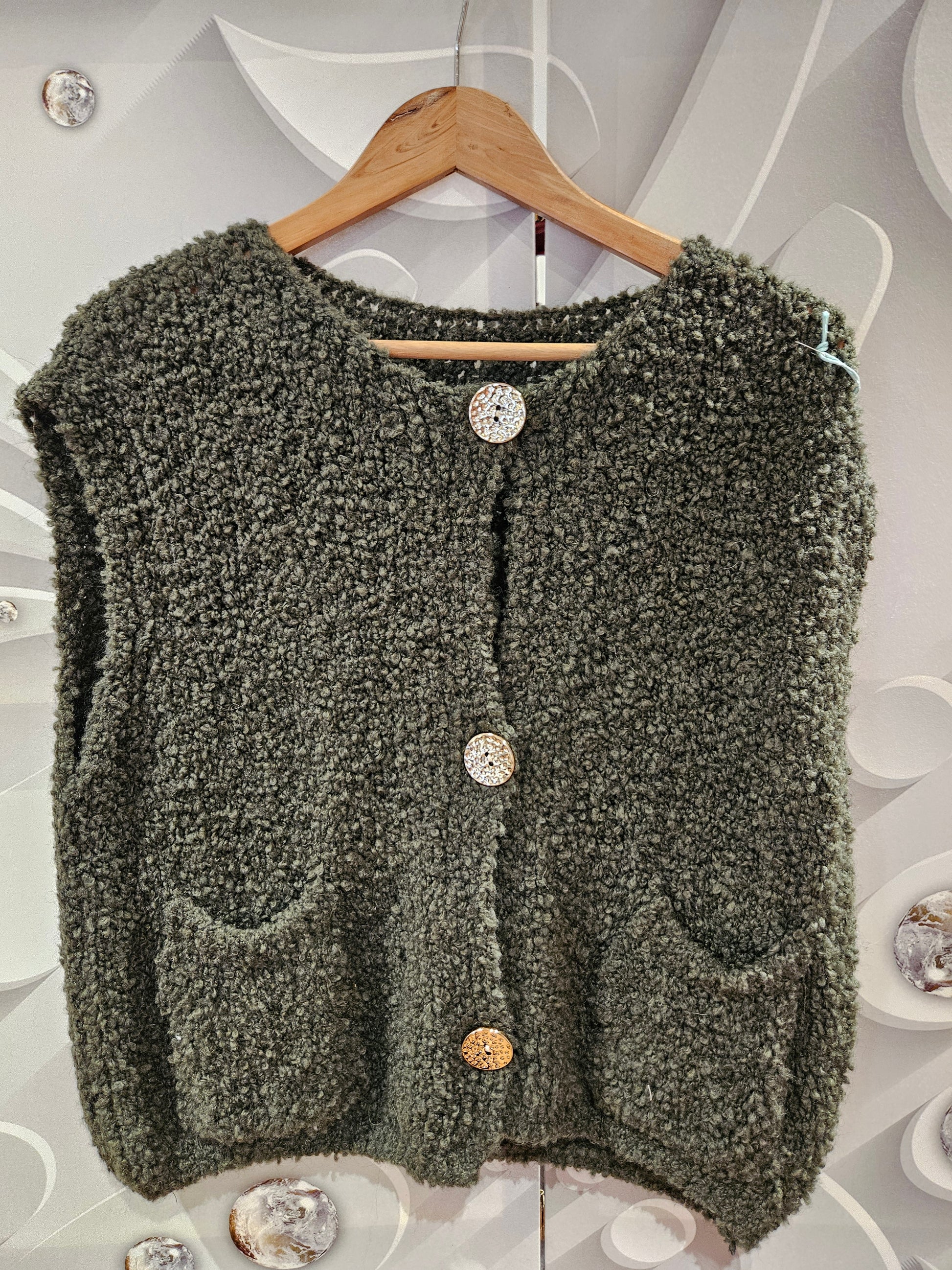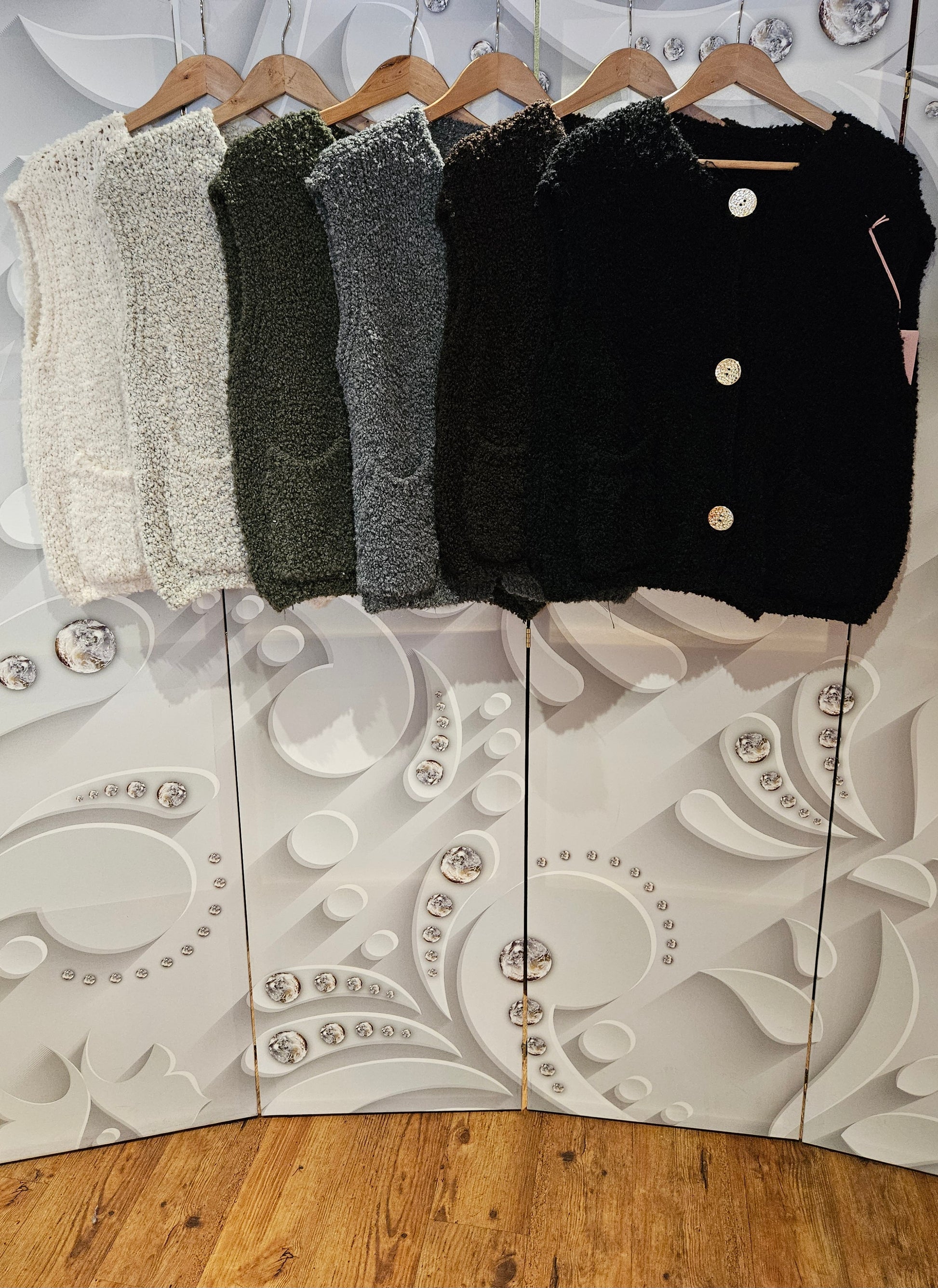 Soft boucle-style gilet vest with a textured teddy-like feel. Features three round gold toned buttons with an embossed decorative texture. Rounded crew neck design with two front patch pockets. Loose, relaxed fit, ideal for layering. Available in six colours. One size.