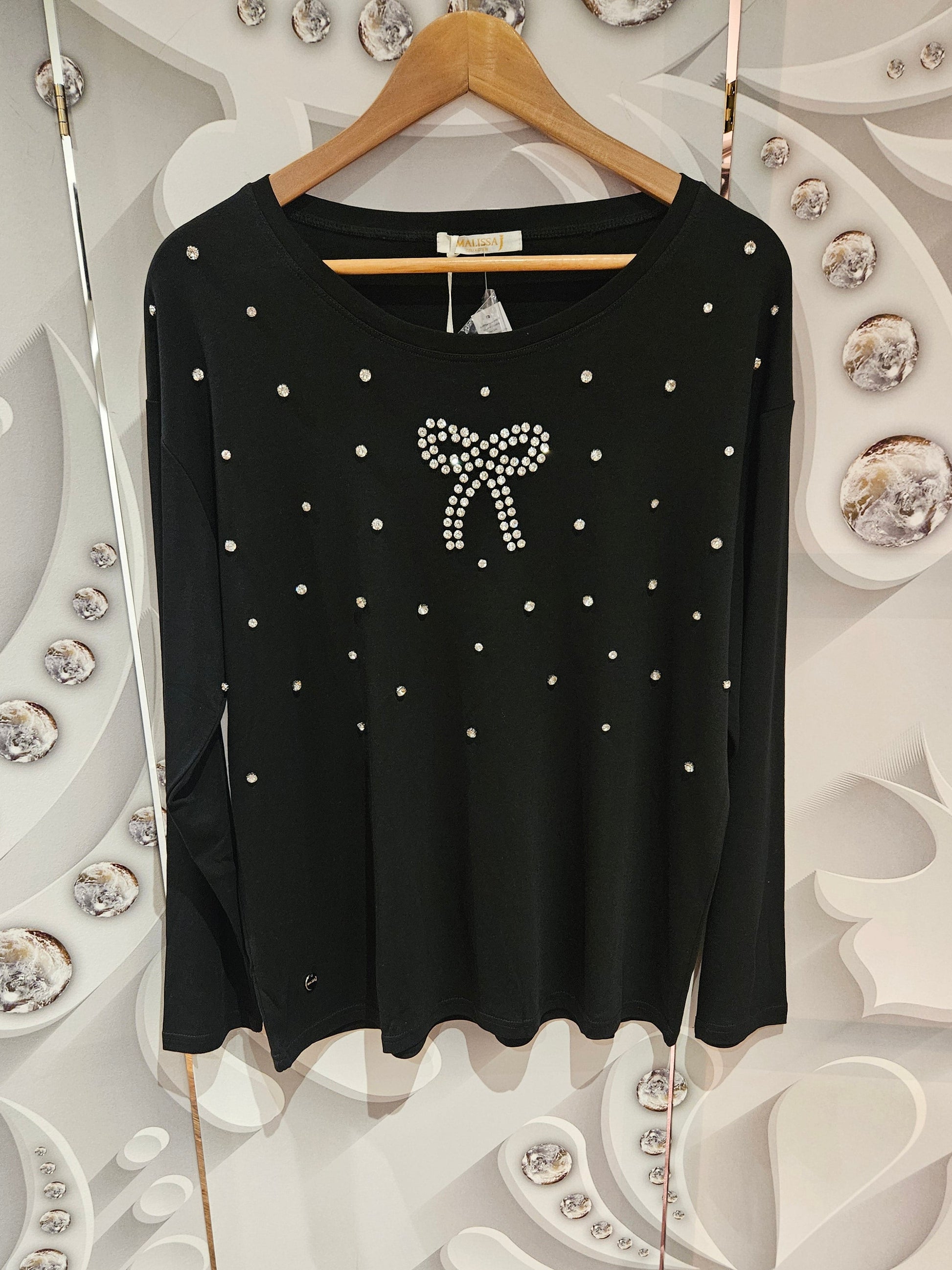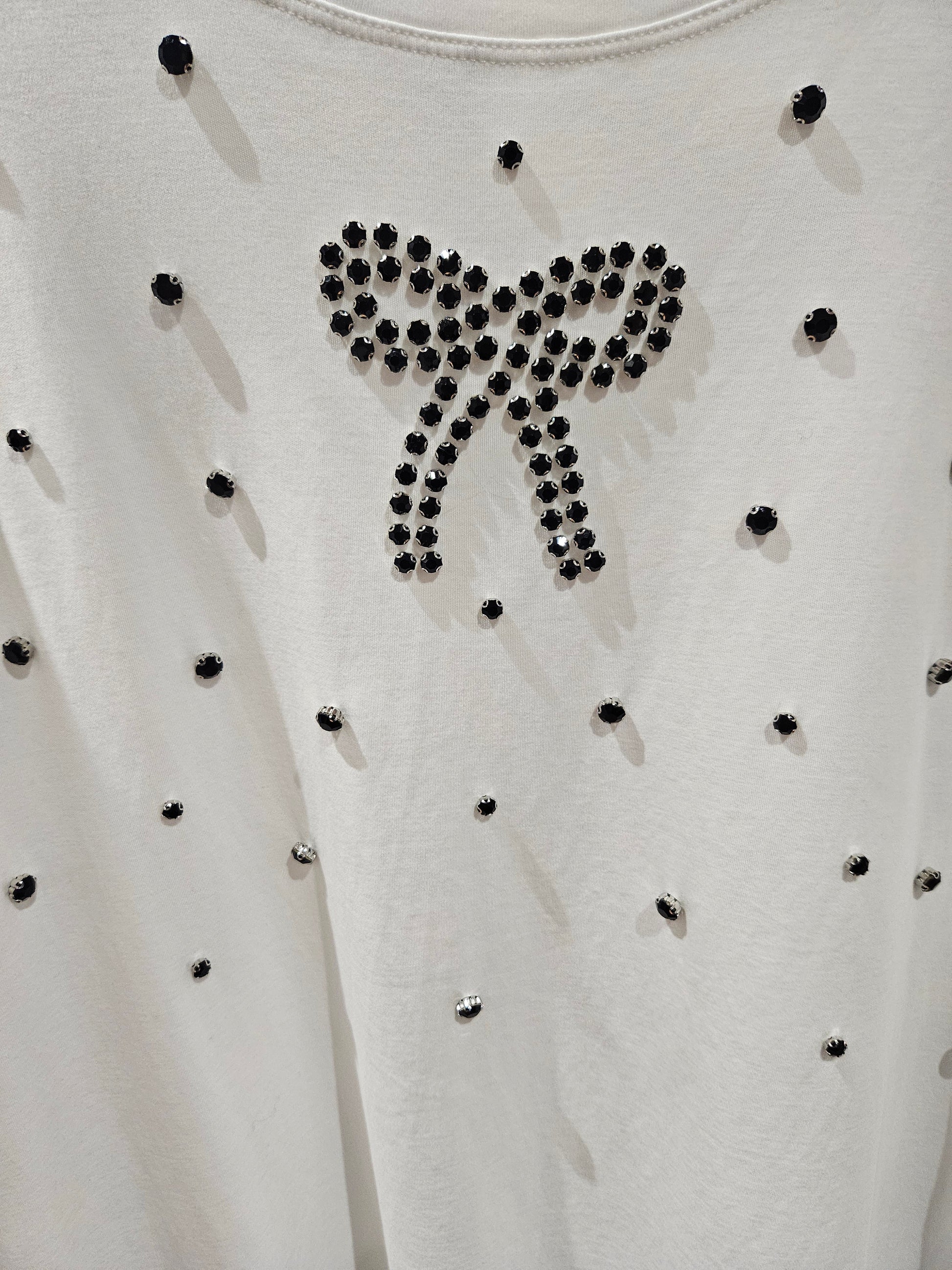 Embellished top with long sleeves and round neck. Features an embellished bow in crystal-like sequins with the same sequins scattered around it. Available in two colours; black (with clear crystal-like sequins) and white (with black crystal-like sequins). One size.