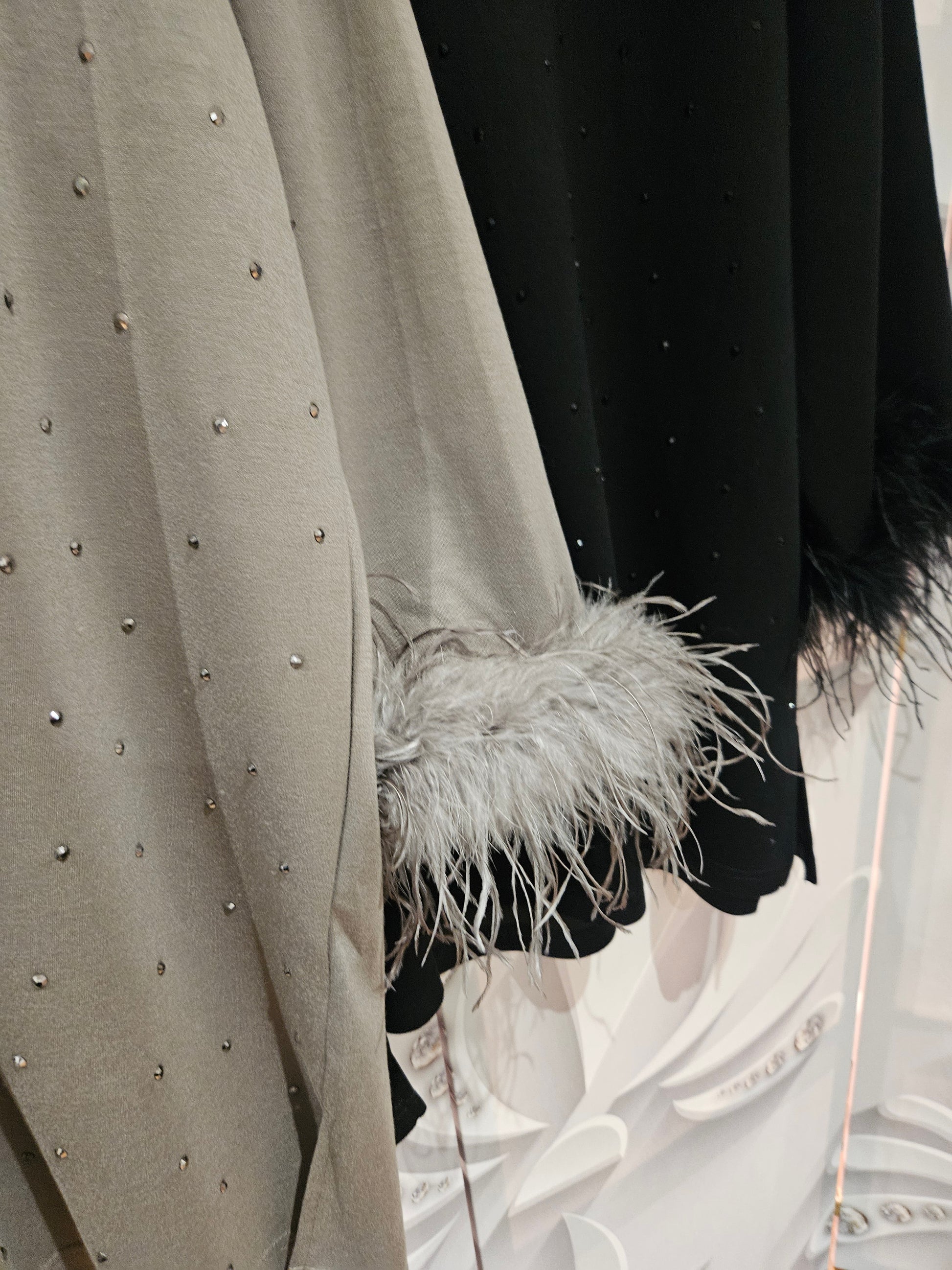 A loose fitting round neck top with 3/4 length sleeves. The top features embellishment on the front with scattered crystal-like sequins in the same colour as the top. The sleeve cuffs have a ruffled feather trim which adds texture and volume. Available in two colours; Mushroom and Black. One size.