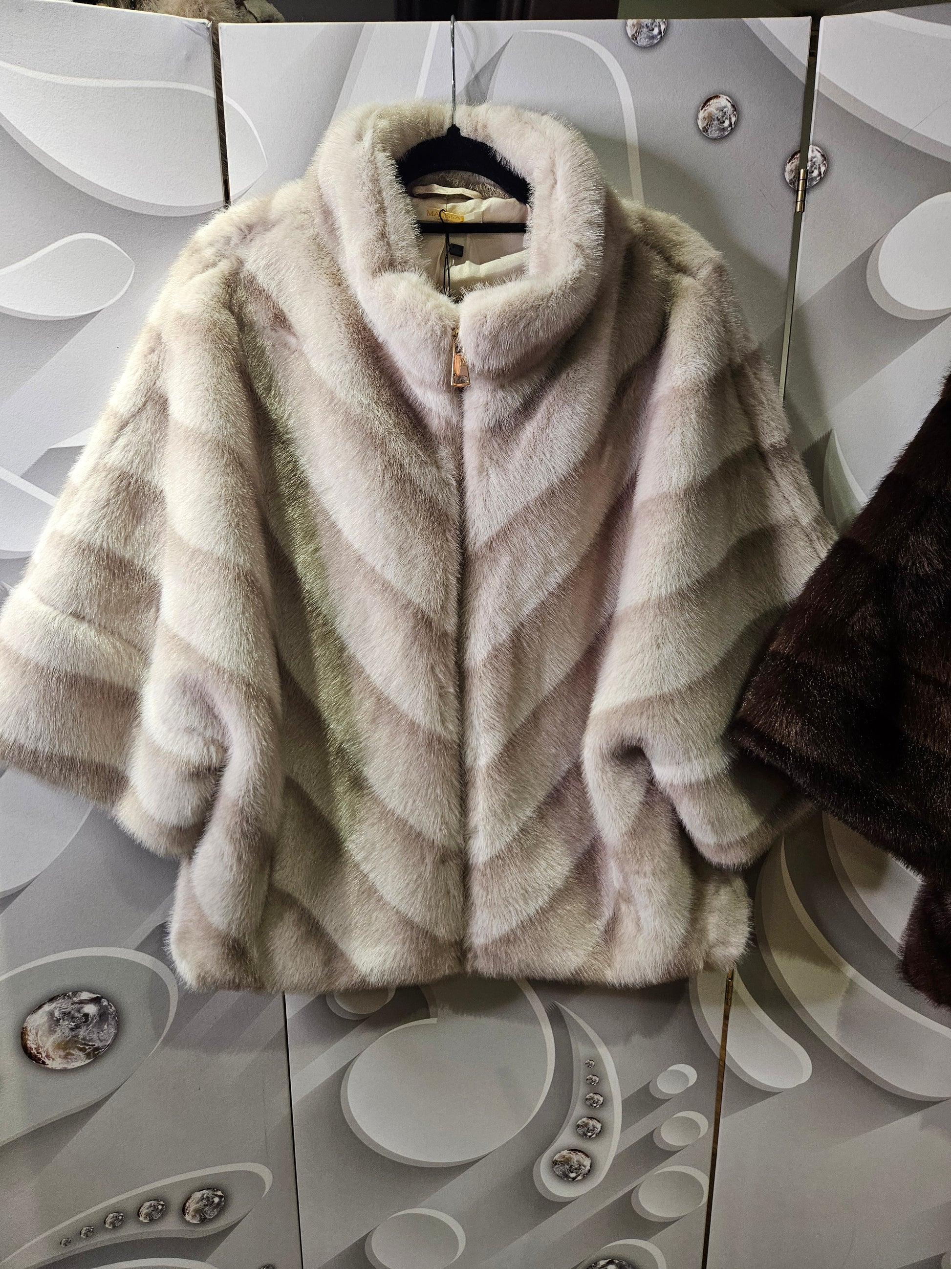 Faux-fur coat jacket with 3/4 length batwing style sleeves. Two toned in colour. Fastened at the front with a zip. Available in two colours; beige and brown. One size.