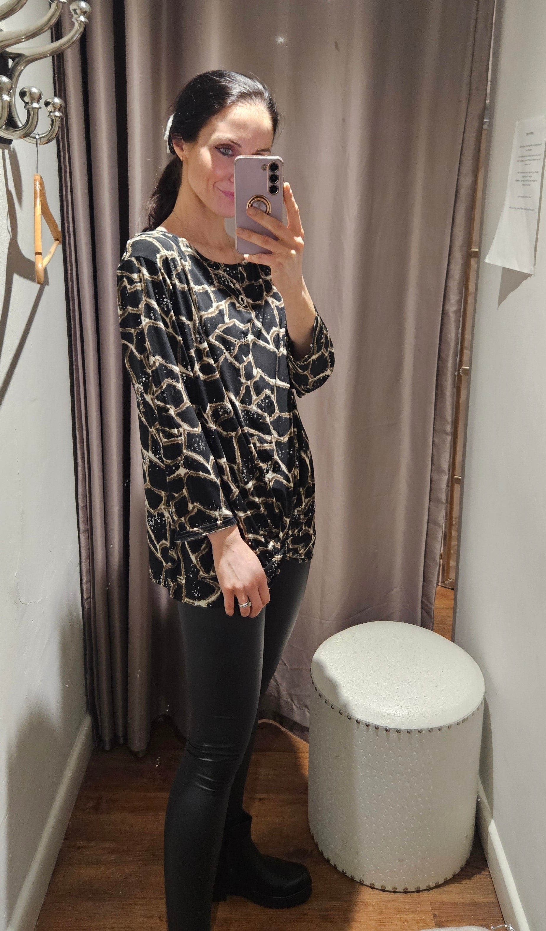 Geometric printed blouse with cropped sleeves and a knotted hemline detail. One size.