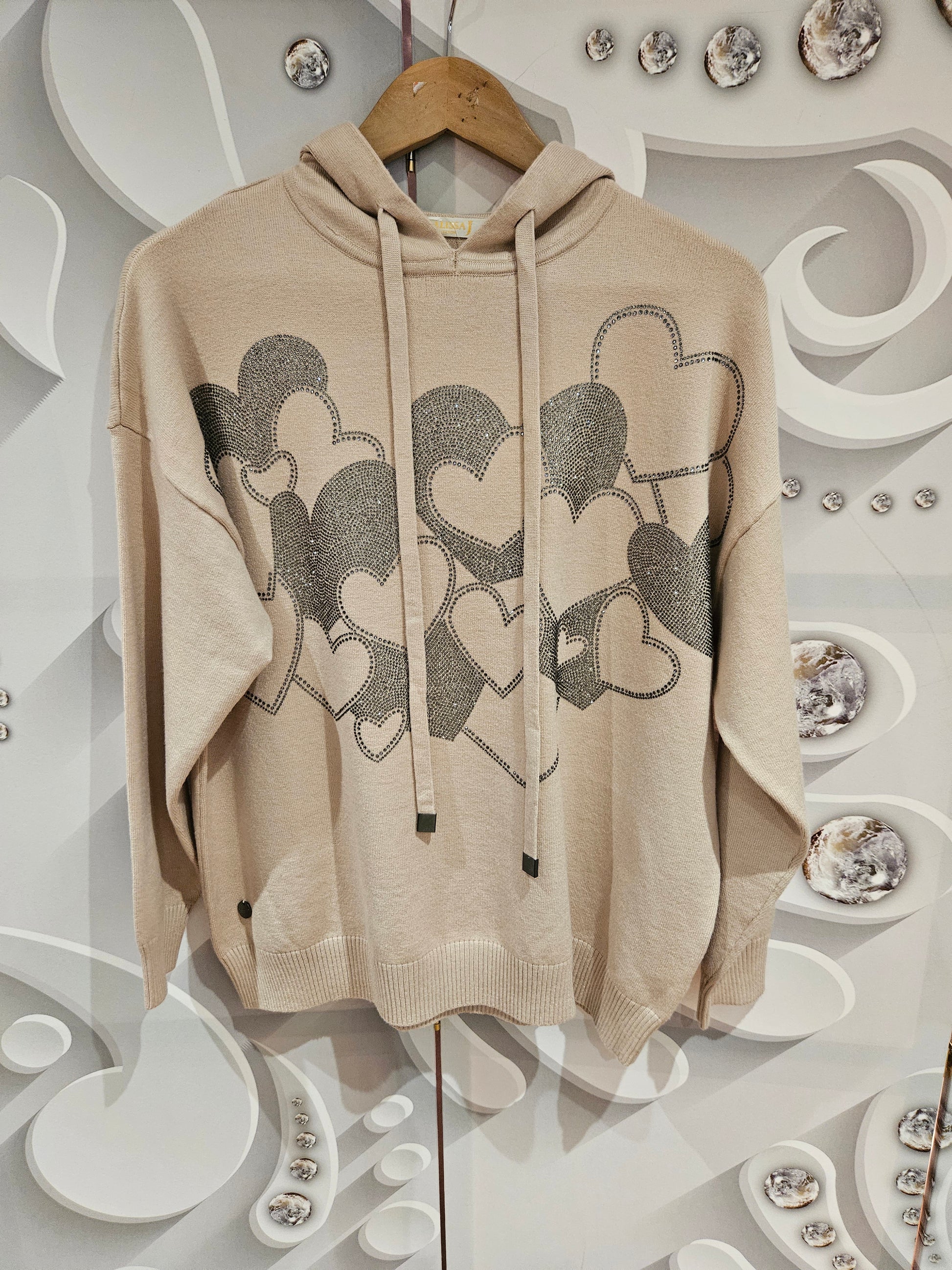 Hoodie with drawstring hood and front embellishment. The embellishment features multiple overlapping hearts in differing sizes with either a sequin outline or fill. Available in 3 colours; ivory, light pink or black. One size.