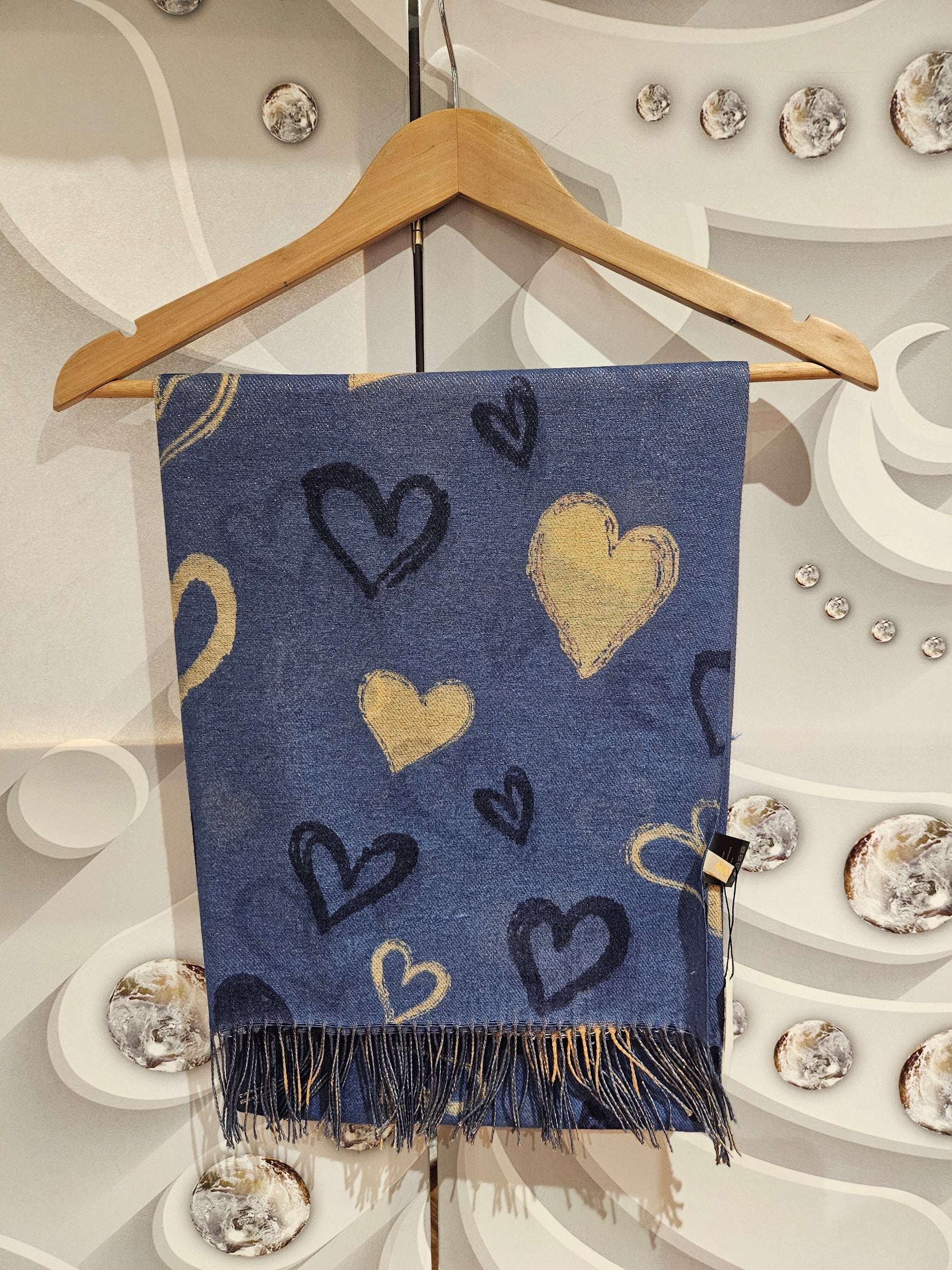 Soft-knit scarf with all-over heart print and tassel edges. Available in two colours; blue and black. One size.