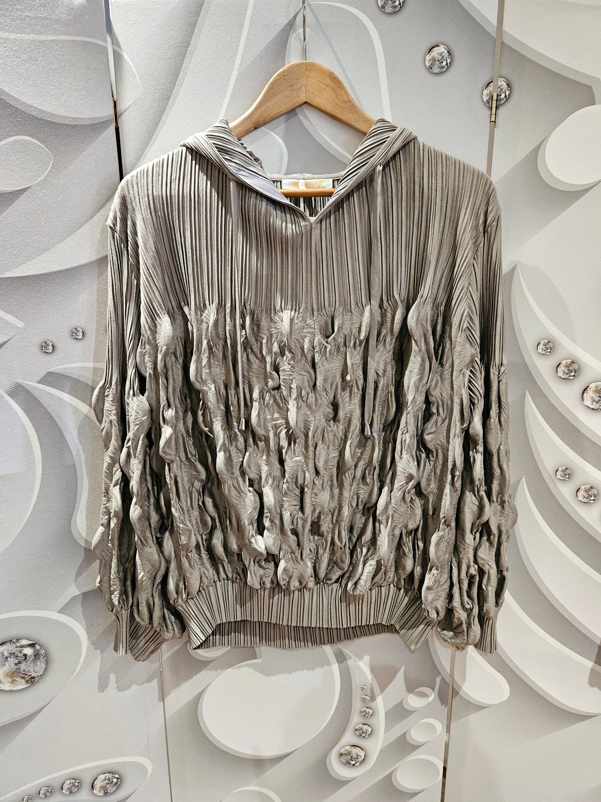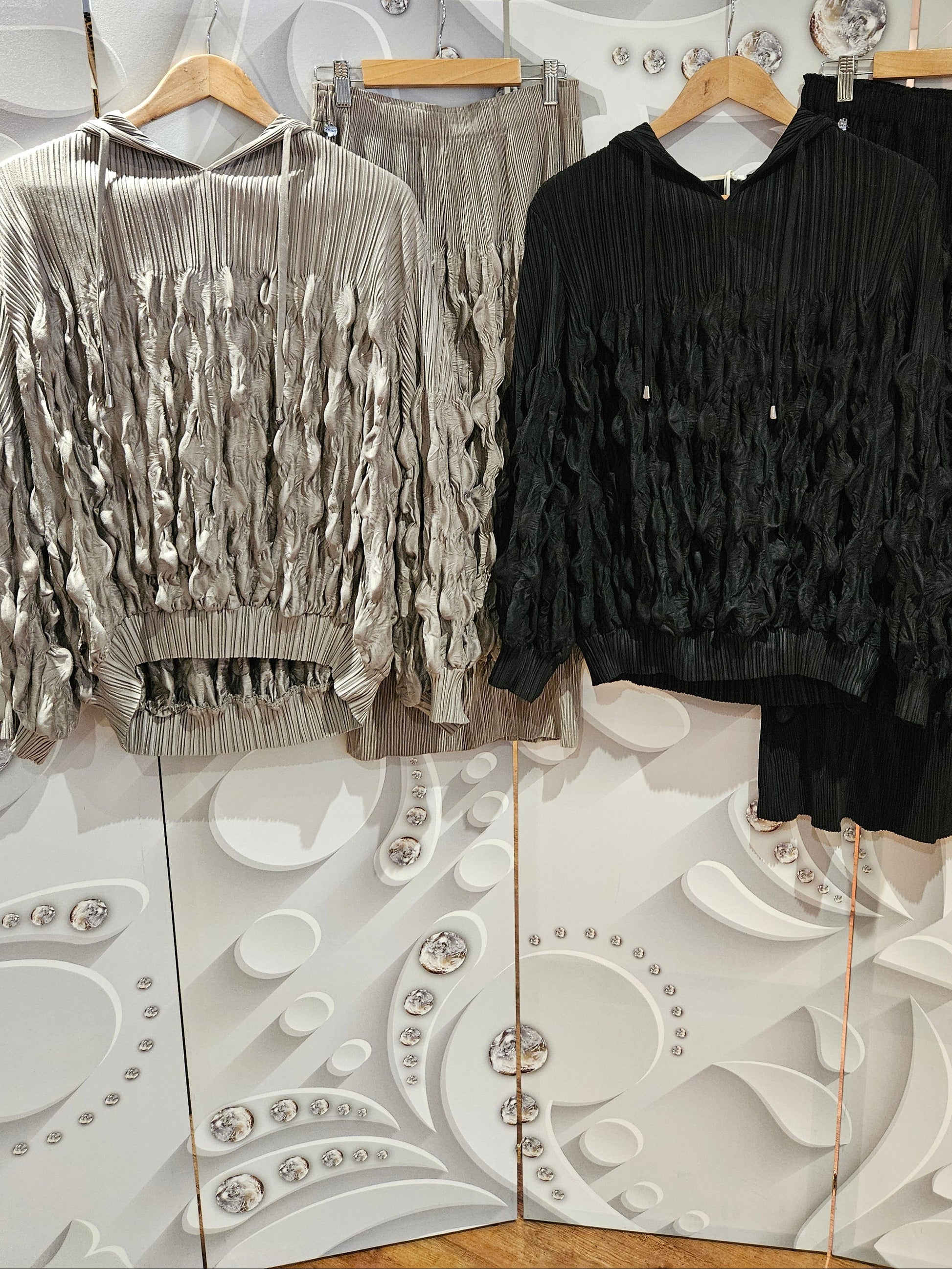 Sculptured hooded top with pleated and ruched fabric details. With a loose, oversized silhouette, the long sleeve pullover has a drawstring hood adding a casual contrast to the design. Finely pleated detail at the top transitions into a ruched, gathered design from the midsection down. Elasticated waist and sleeve cuffs. Available in two colours; Mushroom/taupe and black. Matching Co-Ord skirt available. One size.