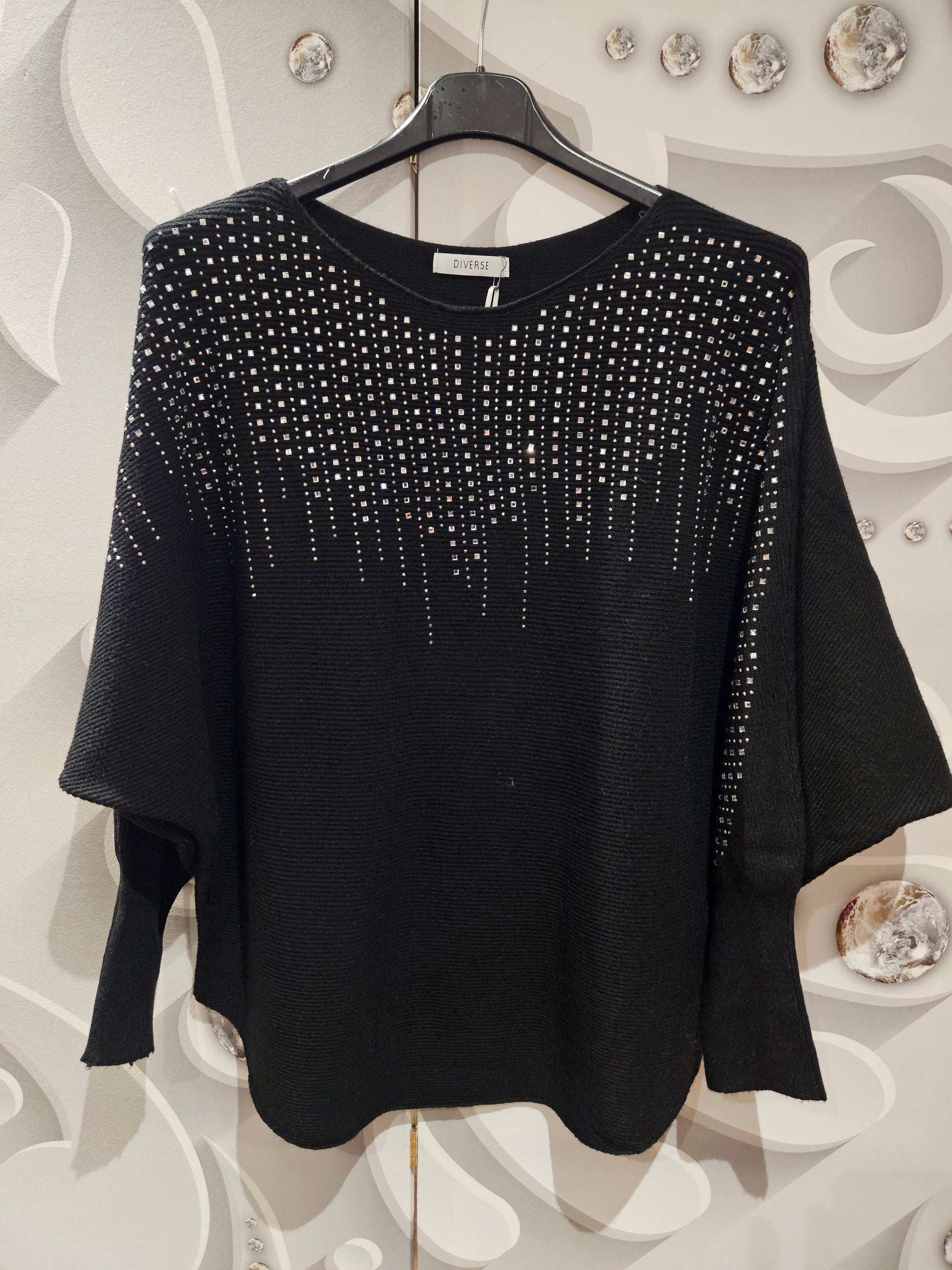Crew neck jumper with batwing style sleeves. Features a studded jewel-like embellished line detail along the front top half of the jumper and along the shoulders. Available in four different colours; black, white, navy and emerald green. One size.