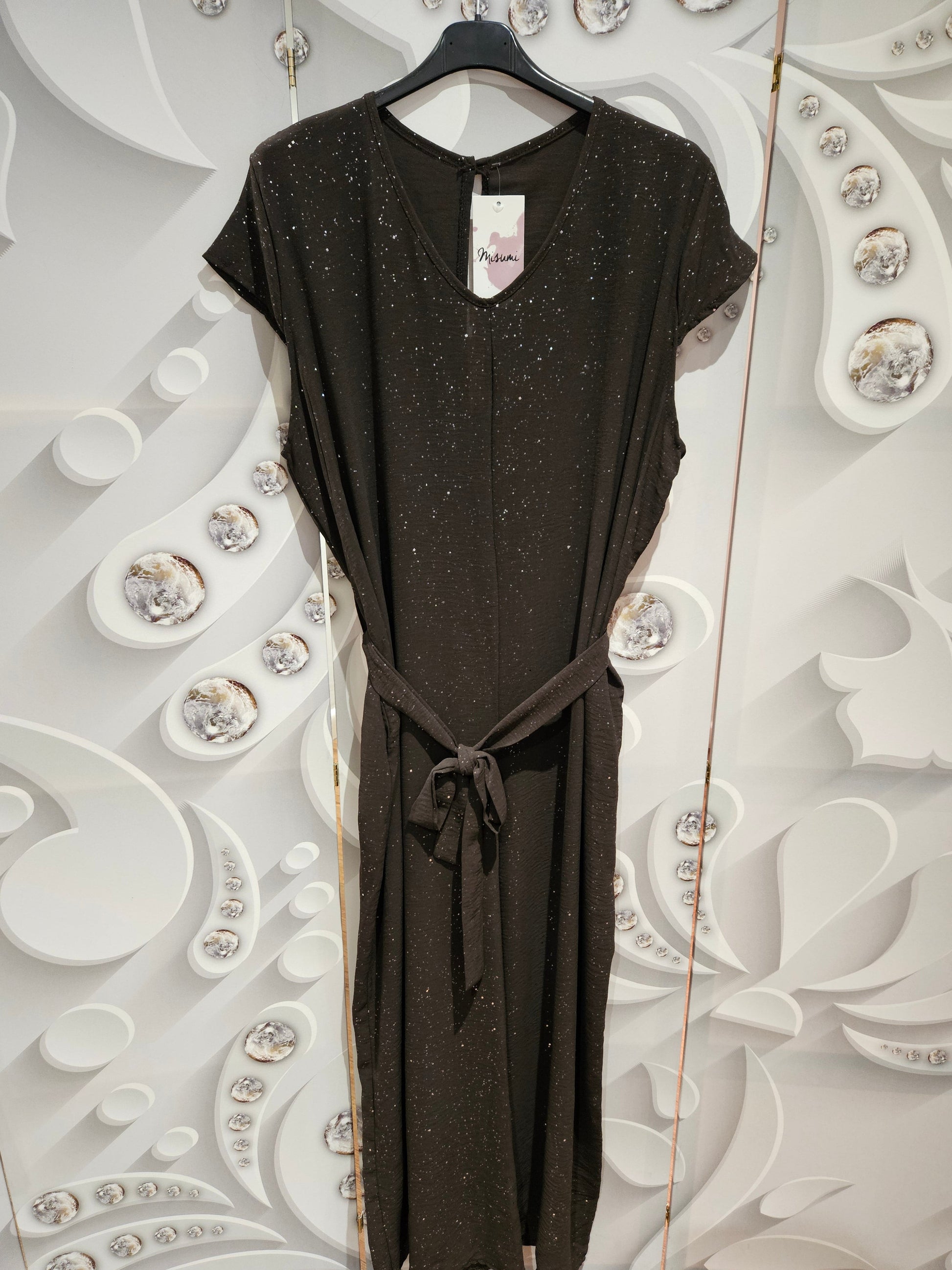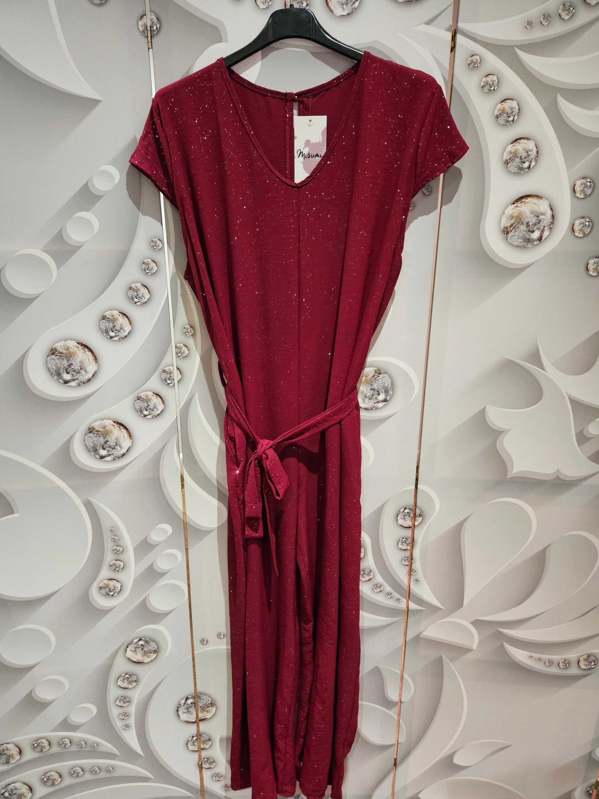 Full length jumpsuit with a rounded v-neckline and cap sleeves with wide armholes. It has a tie waist belt and all-over metallic-glitter specks. Available in three colours; brown, black and red. One size.