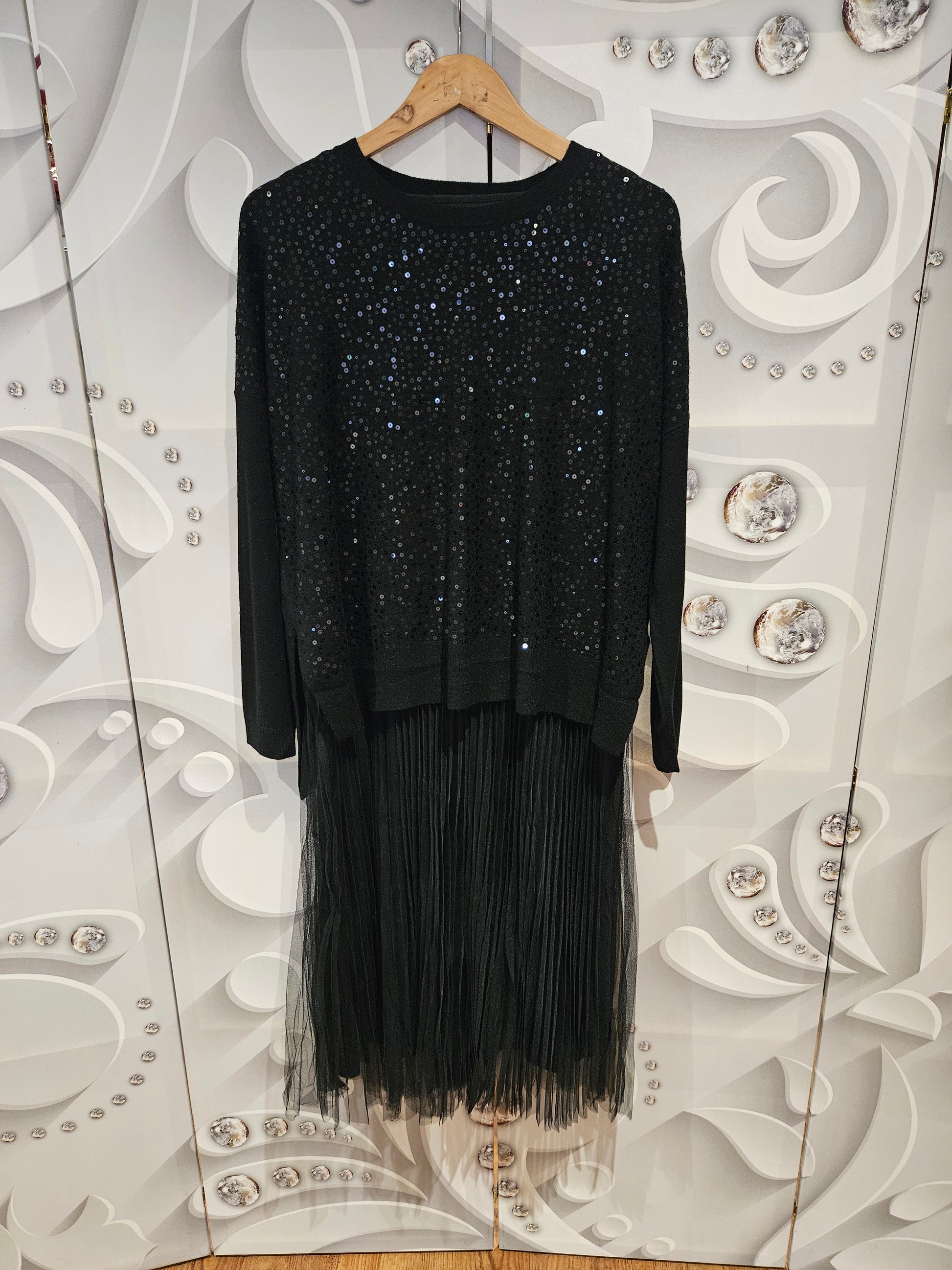 Midi dress co-ord featuring a flowy, pleated midi dress with a sequined jumper on top. The jumper has a loose fit with sequence on the front whilst the dress has a sheer layered fabric. Available in three different colours; brown, black and grey. One size.