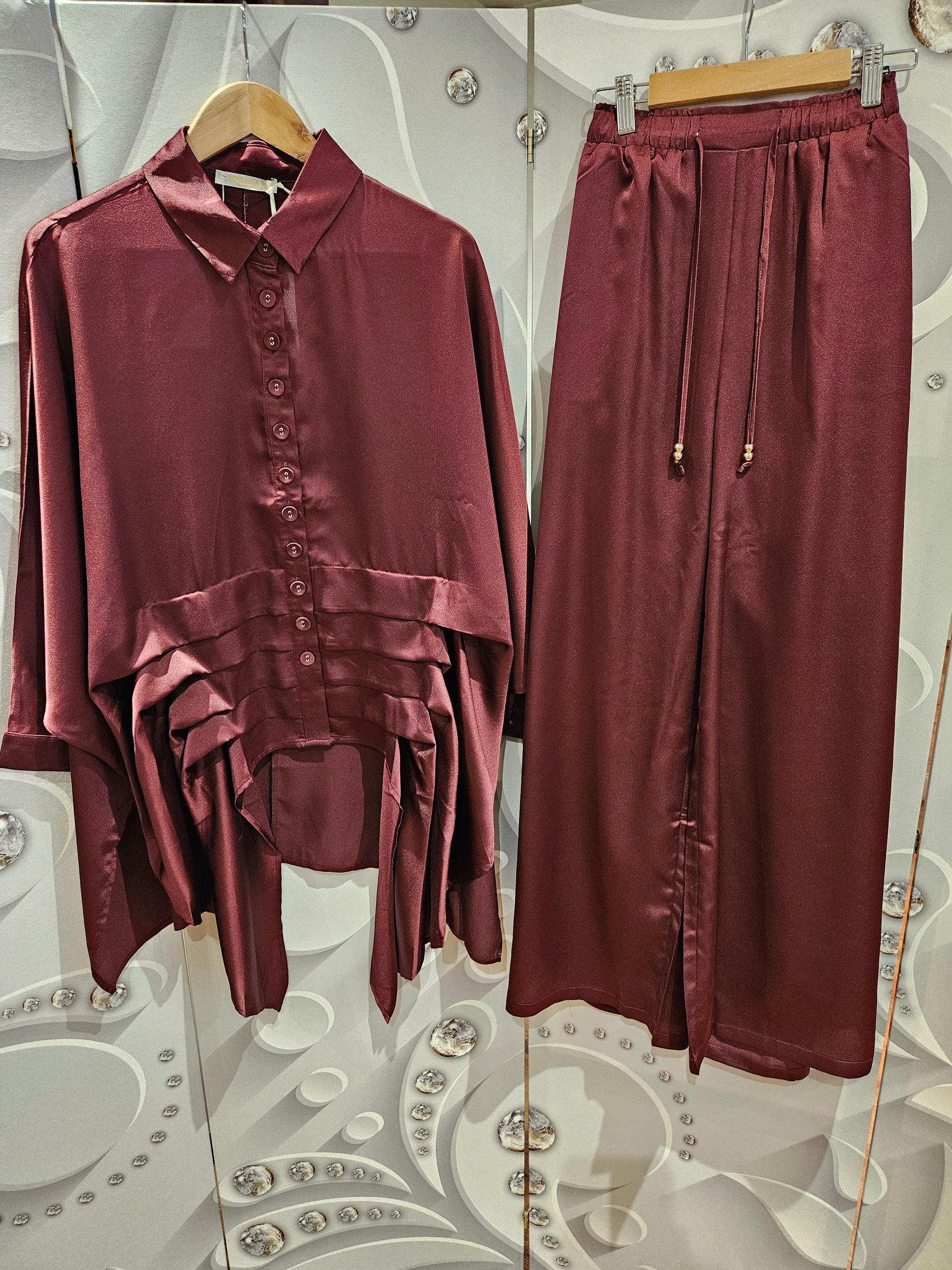 Oversized blouse with collar and batwing-style sleeves. Buttons down the front with a layered, pleated-like design to the bottom hemline which creates a flowing effect, adding a feminine feel. Available as a Co-Ord with matching trousers. Available two colours; wine-red and mushroom/taupe. One size.