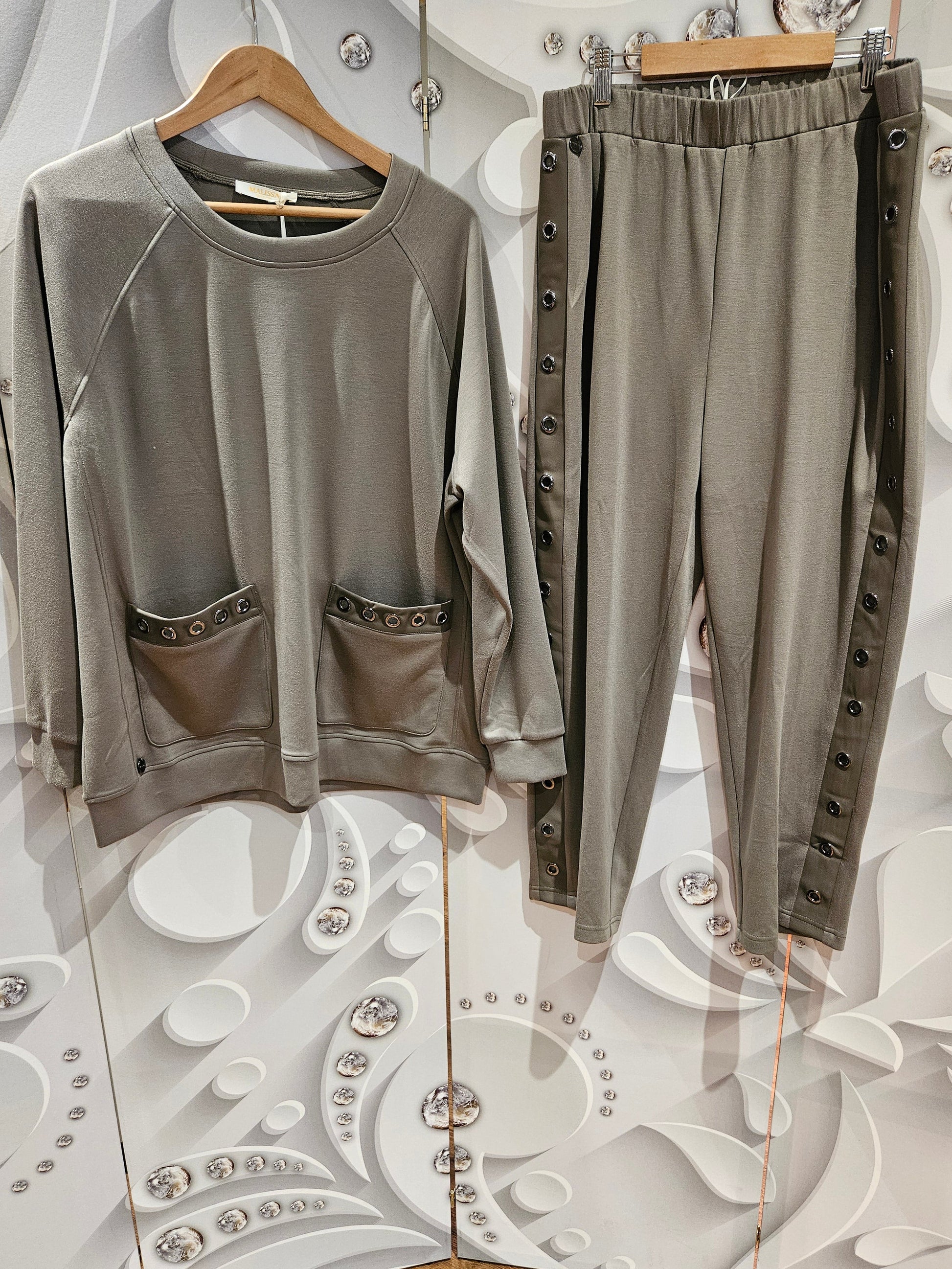 Crew neck top in mushroom/taupe shade featuring a decorative eyelet detail on the trim of the two front pockets. One size. Matching co-ord trousers available.
