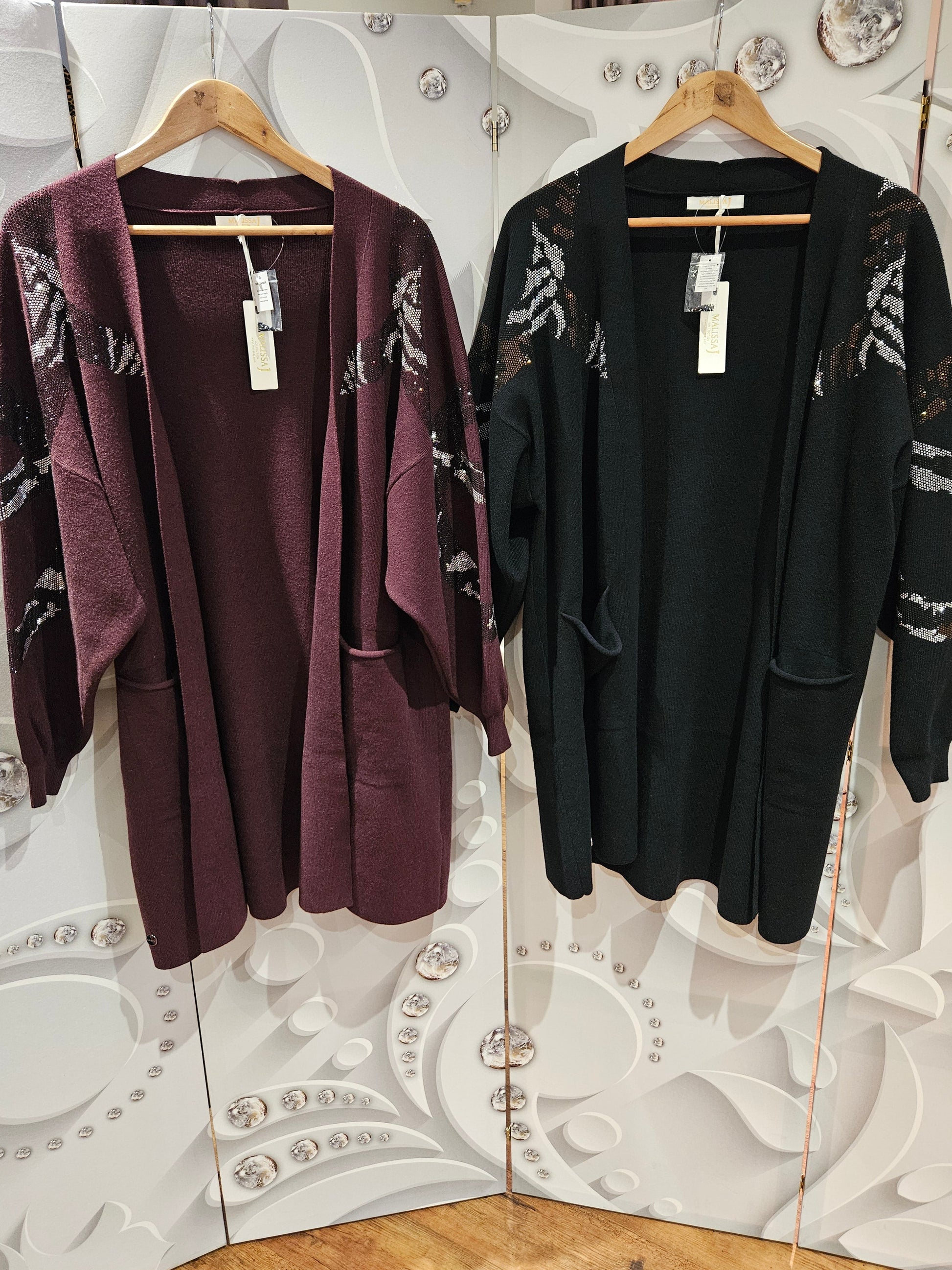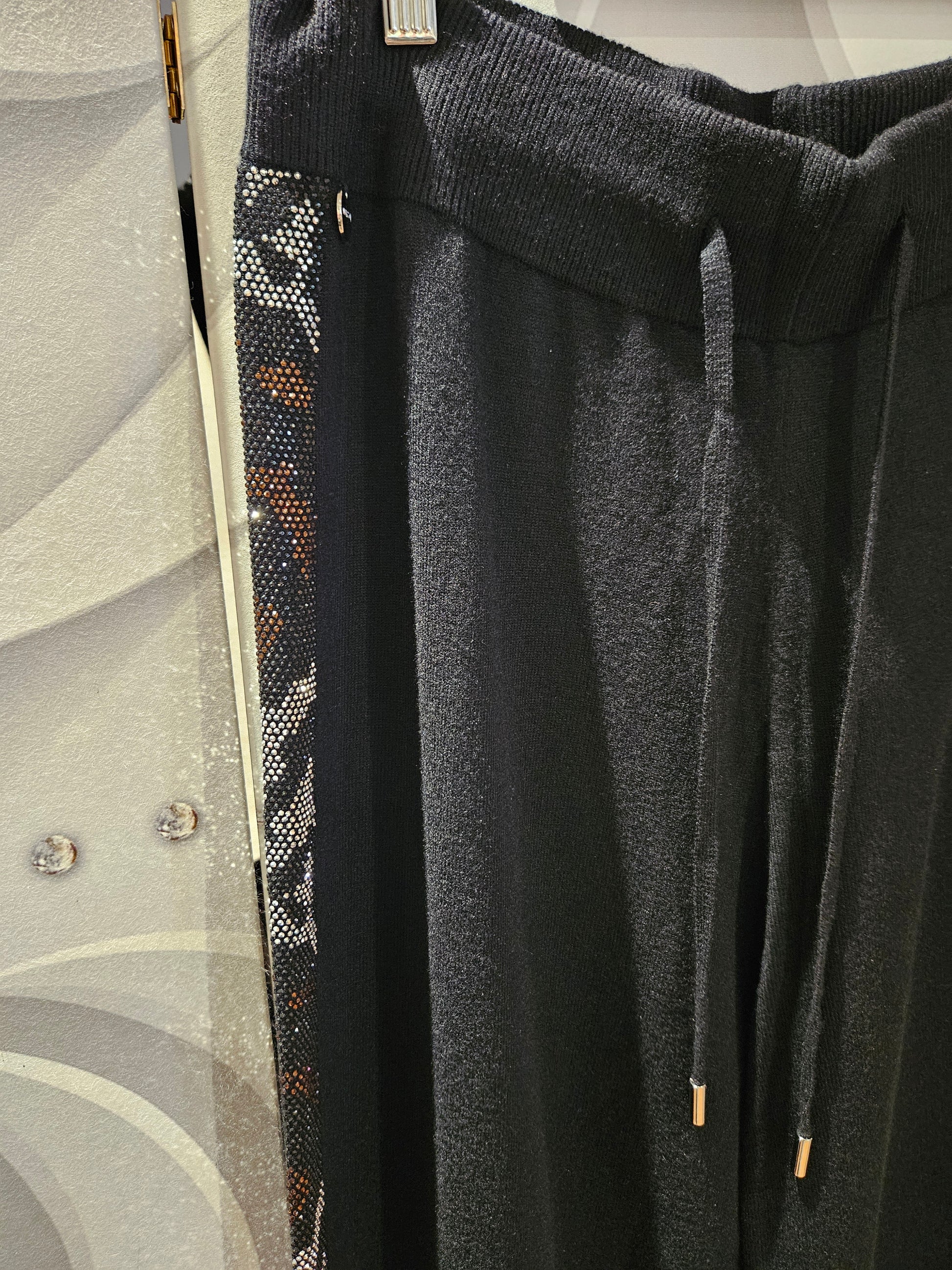 Wide-leg trousers with drawstring. Features a side stripe with an embellished, animal print like design which consists of metallic tone sequins in the trouser colour and contrasting silver/white and gold coloured sequins. Available in two colours; wine and black. Also available as a Co-Ord with matching longline cardigan. One Size.